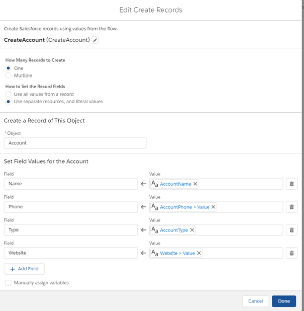 For the Demo Purpose we are going to create an Account using Multi Column Screen in Flow. To do so, we drag 4 fields here, but you can add more fields if you need. We also need one Create Record Action to create the Account Record. And finally we display a success message to users with the record id of the newly created account. For this we will create another screen component and display the success message.