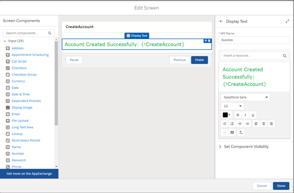 Screen Flow can be added to a Lightning page, a Lightning Community, or can be launched from a Quick Action. You can control the header and footer for the screen. Moreover, control the navigation in between screens by enabling or disabling ‘Next or Finish’ and ‘Previous’ buttons. There is also a provision to ‘Pause’ the Flow which can be resumed by the users later. Screen element of Flow contains various standard input components. You can choose from Picklist, Button, File Upload and everything in between.